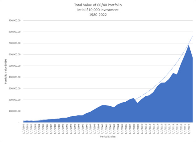 Since the beginning of 1981, a 60/40 portfolio that is invested in Russell 3000 and Bloomberg Aggregate Bond Index has averaged a total annual return of 9.87%. That means that an initial $10,000 investment would be worth $571,724.55. Cool. Let's start investing, and start making money.